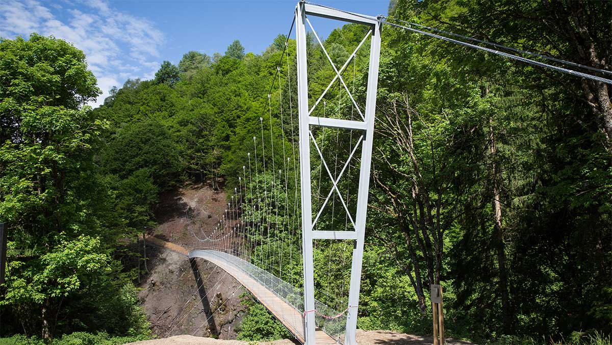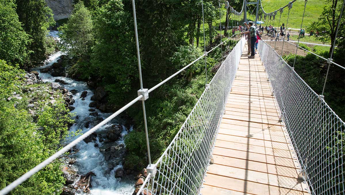 Die eindrückliche Hängebrücke über das Schlappintobel ist ein integrativer Teil der Ausgestaltung des Klosterser Höhenweges und ein wichtiges Teilprojekt des PRE Klosters. Der Bau zur Brücke startete im Frühling 2017 und ging zügig voran. Mit einer Gesamtlänge von stattlichen 70.5 Metern überspannt die Seil-Holzkonstruktion das Schlappintobel mit einem höchsten Punkt über Gelände von 19 Metern.